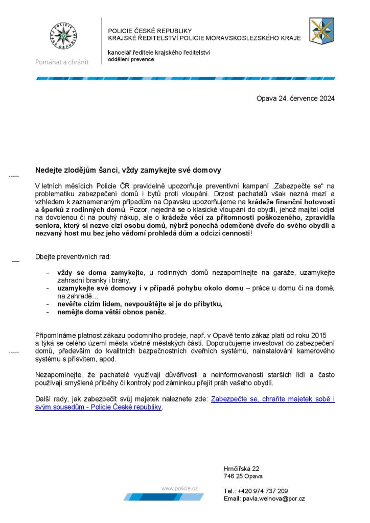V letních měsících Policie ČR pravidelně upozorňuje preventivní kampaní „Zabezpečte se“ na problematiku zabezpečení domů i bytů proti vloupání. Drzost pachatelů však nezná mezí a vzhledem k zaznamenaným případům na Opavsku upozorňujeme na krádeže finanční hotovosti a šperků z rodinných domů. Pozor, nejedná se o klasické vloupání do obydlí, jehož majitel odjel na dovolenou či na pouhý nákup, ale o krádeže věcí za přítomnosti poškozeného, zpravidla seniora, který si nezve cizí osobu domů, nýbrž ponechá odemčené dveře do svého obydlí a nezvaný host mu bez jeho vědomí prohledá dům a odcizí cennosti!
