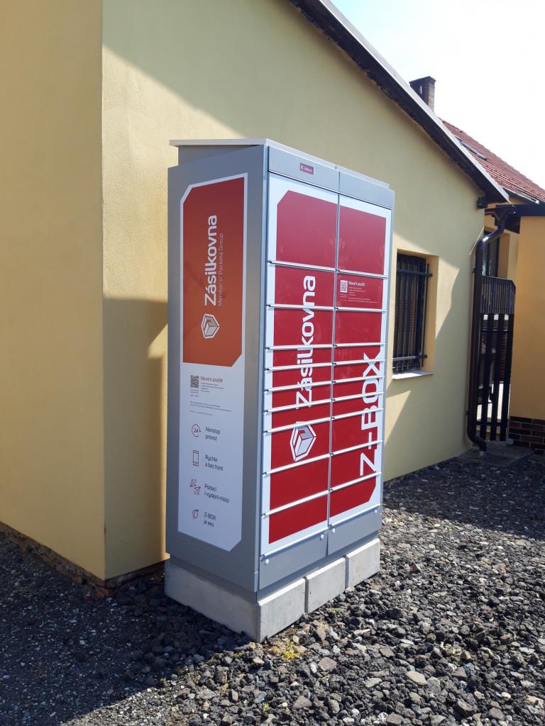 Zásilkový automat ZBOX je umístěn za skladem vedle obchodu Hruška na ul. U Hřiště 24.